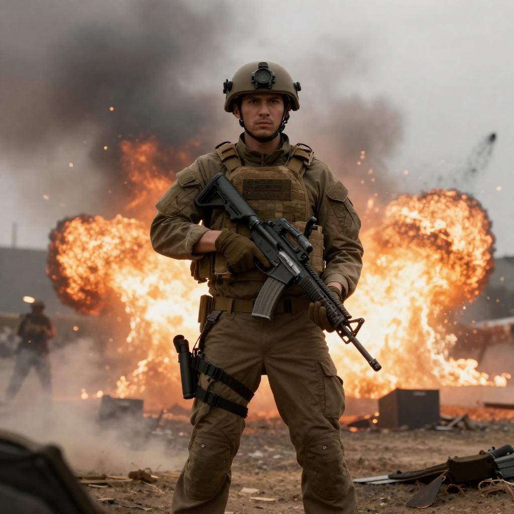 Photograph of a male soldier in tactical gear with a determined expression, holding a rifle in each hand. He stands amidst an intense battlefield with explosions and smoke in the background. The soldier is centered, with the chaotic sky and flames surrounding him, creating a dramatic and action-packed scene.