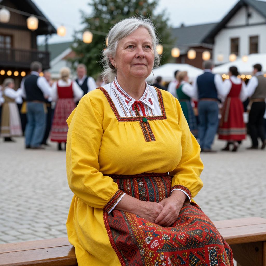 A scenic, authentic-style image of an older woman with a gentle facial expression, silver hair tucked behind her ears, dressed in a traditional Swedish folk costume with a bright yellow dress, wide sleeves, and a patterned red apron, sitting on a wooden bench in a village square during a folk festival with lanterns and dancing people in the background.. The woman has big breasts and cute face
