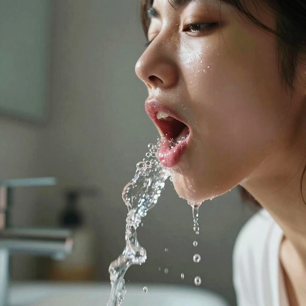 A person gargling with mouth open and water swirling, vivid water reflections and bubbles, strong lighting contrast, modern bathroom background, ultra-detailed facial expression, digital art style