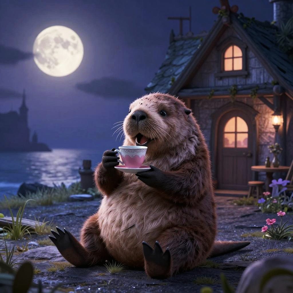 Lowbrow art of a joyful walrus sipping tea, influenced by Tim Burton, with a cozy seaside cottage, soft lighting, whimsical and surreal