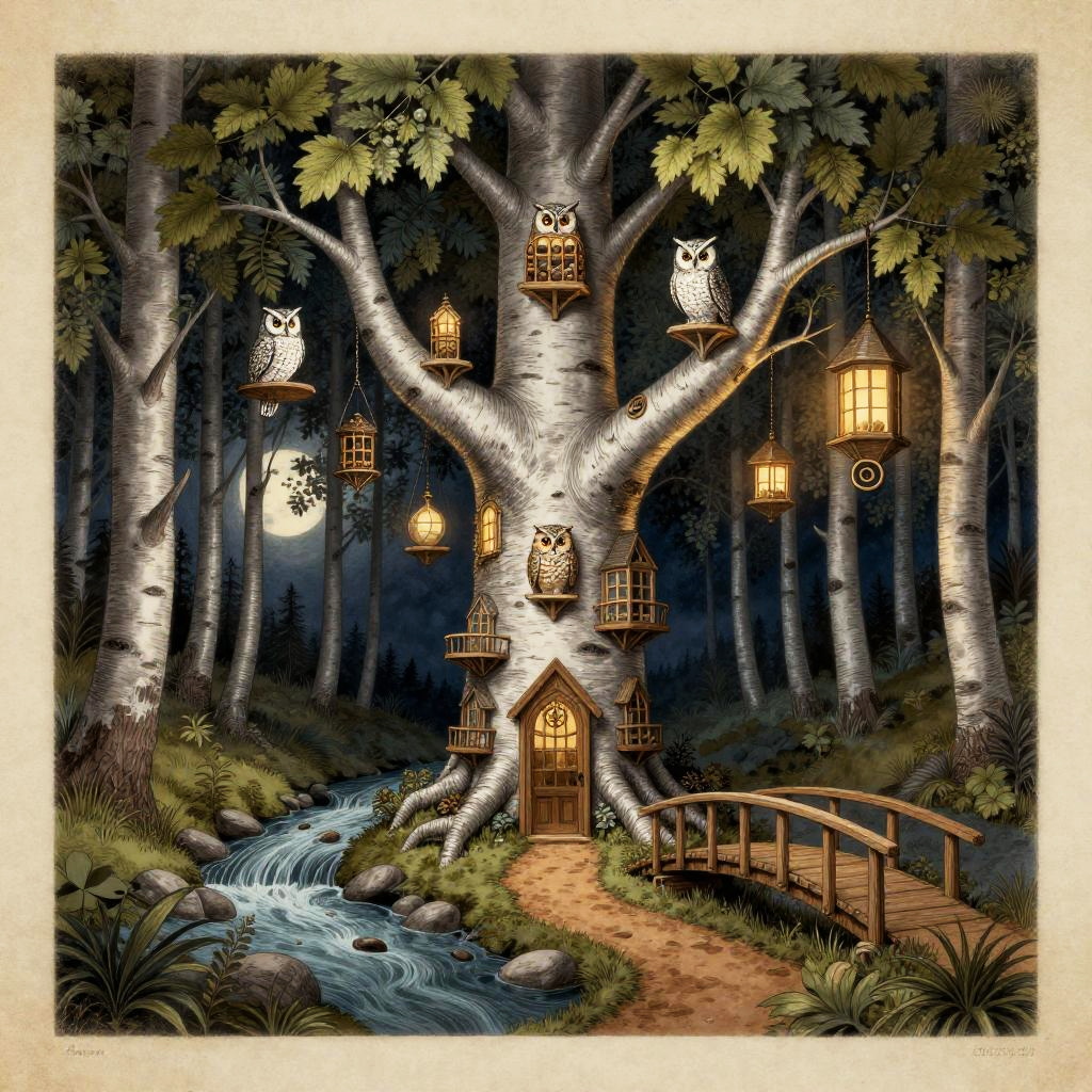 Anton Pieck style illustration of a nocturnal herbarium and owlery woven into a giant silver birch, with spiral galleries, hanging seed lanterns and perches, large continuous tree, leafy roof, inviting entrance with bridge, connected paths, in a moonlit silver-birch grove by a whispering brook, flowing stream, waterfall, vintage paper texture, intricate line work, high detail, mystical atmosphere, warm and nostalgic tones, soft lighting, high quality, warm window lighting