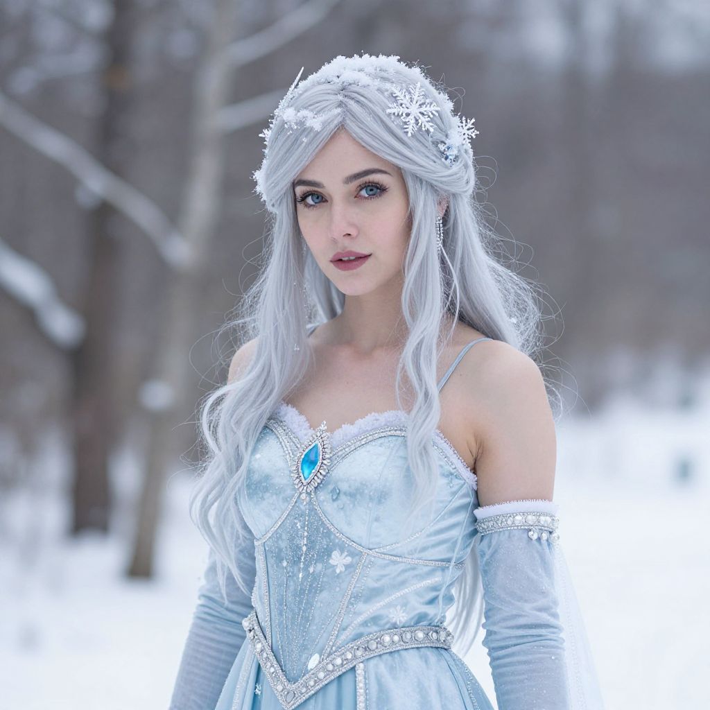 A woman dressed in an elaborate icy-themed costume stands outdoors in a snowy setting, captured in soft natural light. Her silver hair, detailed snowflake accents, and cool-toned outfit create a fantasy winter queen appearance with a modern cosplay style.