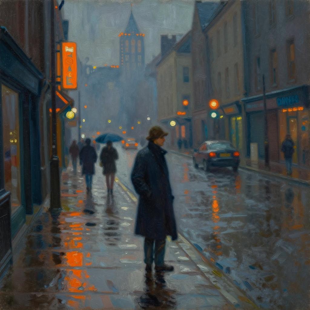 Impressionist style painting of two young men dressed in blue suits with bow ties standing in a garden. One man is partially hidden behind a tree while the other faces him. The background features soft, muted pastel tones with a tall, blurred tower and distant buildings, creating a calm, vintage outdoor atmosphere.