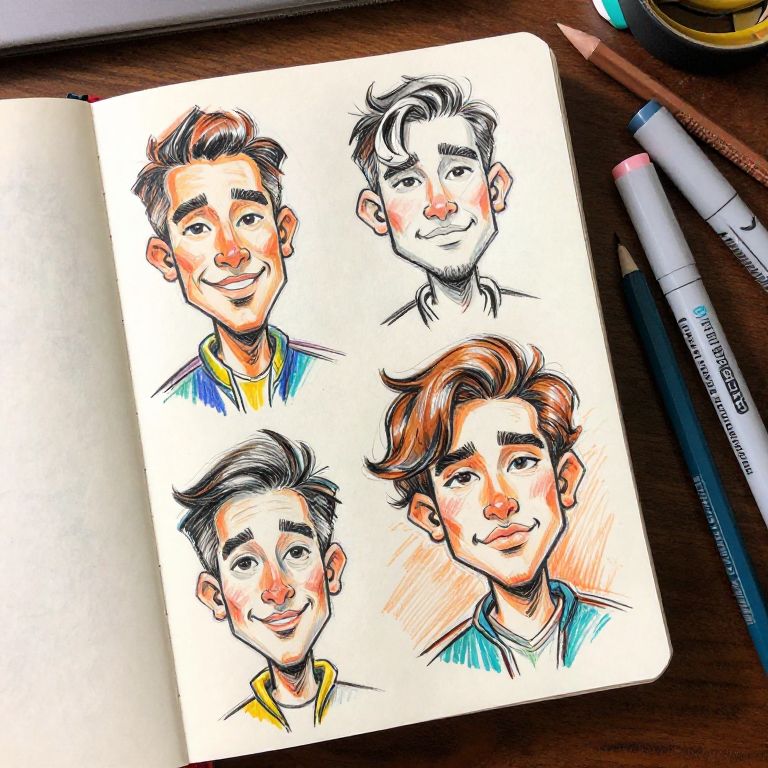 How to draw a caricature step by step, vibrant sketchbook page with exaggerated facial features, colorful pencils and markers scattered around, dynamic expressive lines, warm lighting highlighting artistic workspace, modern art style