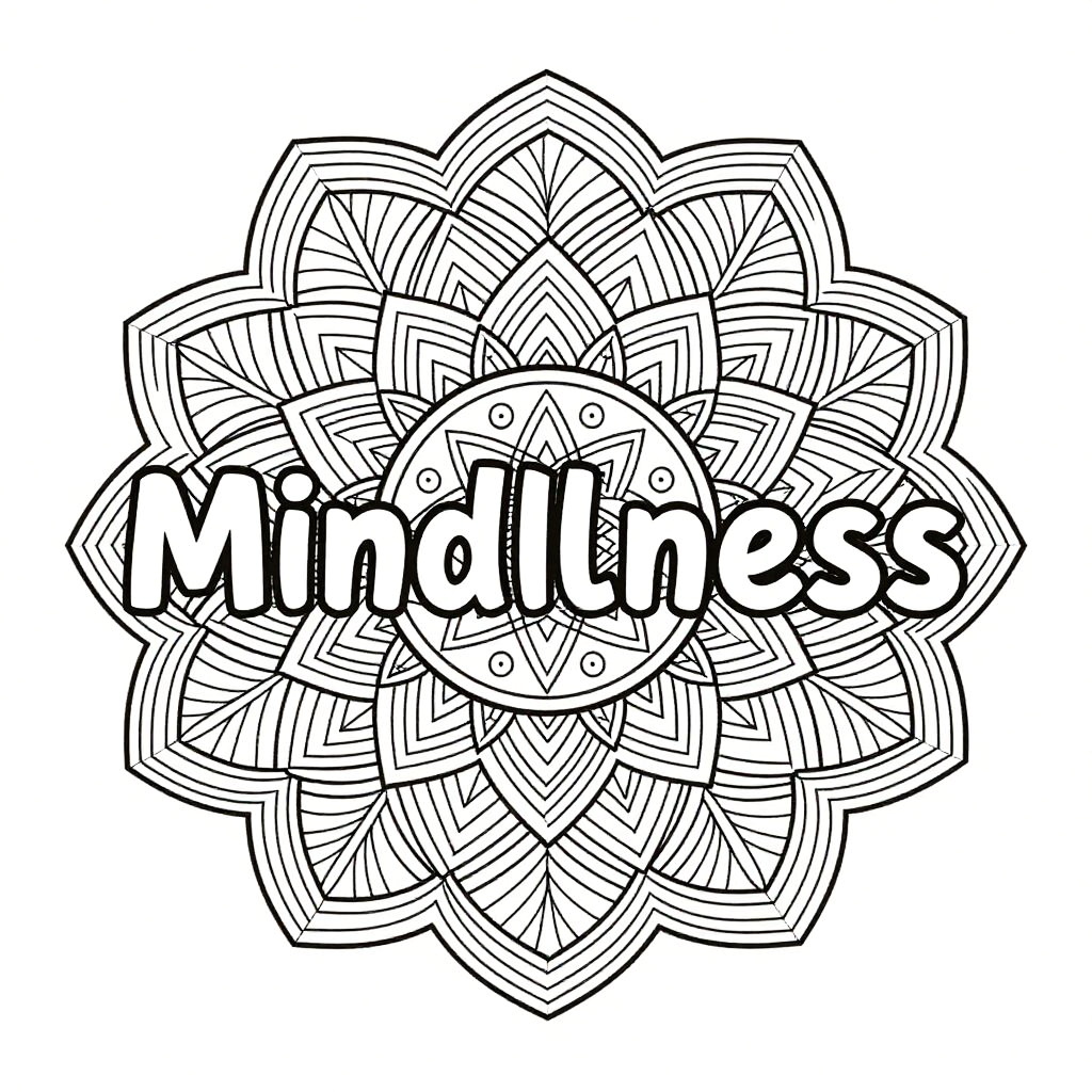 Word coloring page generator crafting a detailed mandala style layout with words integrated into geometric patterns, featuring repetitive symmetrical designs, emphasizing mindfulness and calm, suitable for intricate coloring pens and markers.