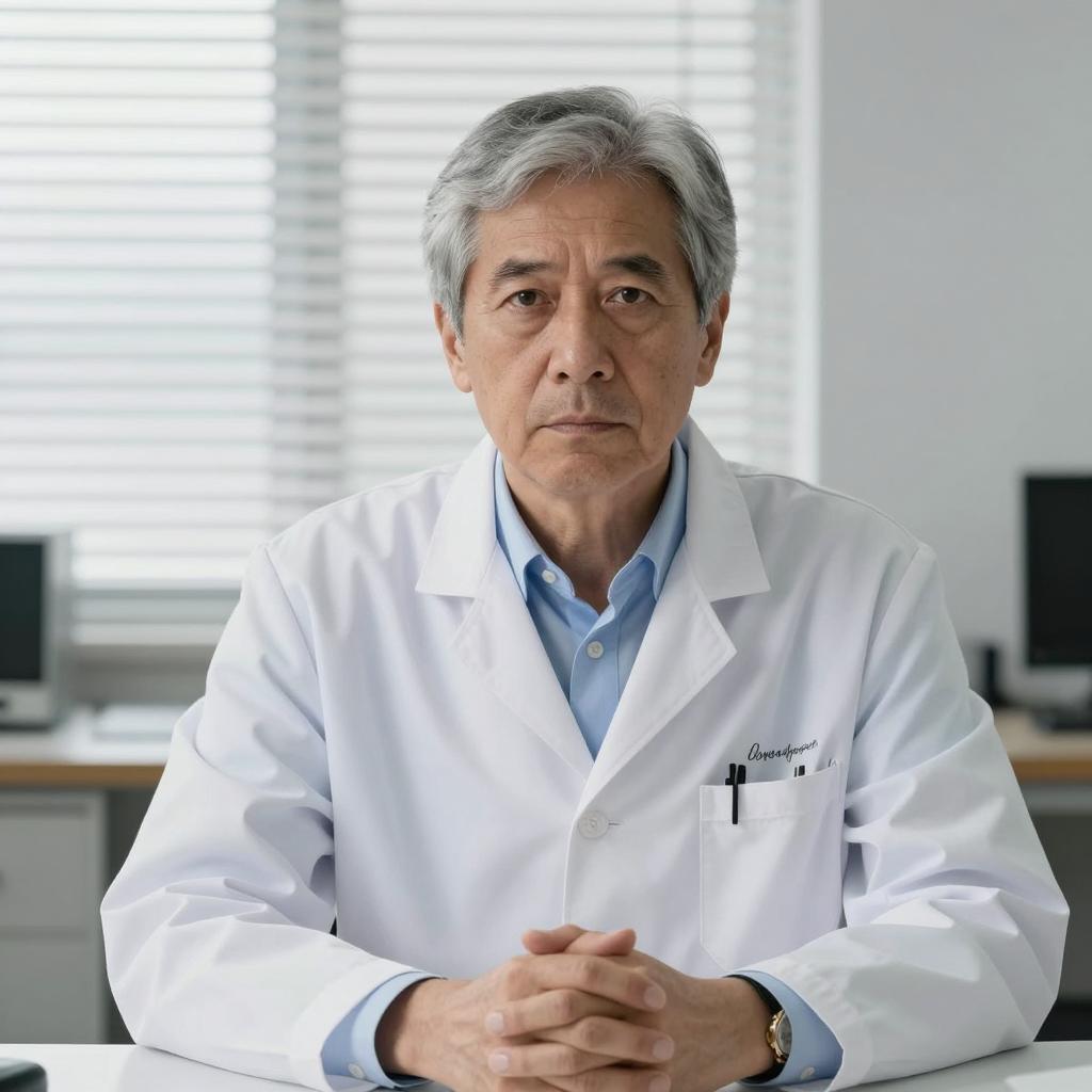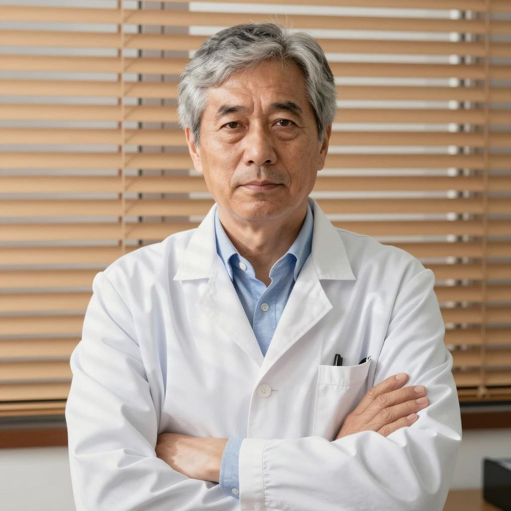 Middle-aged man with gray hair, white lab coat, blue shirt, arms crossed, sitting in front of closed wooden blinds. Light from blinds casts horizontal shadows on his face. Neutral facial expression. Office setting. Man centered, slightly leaning forward.