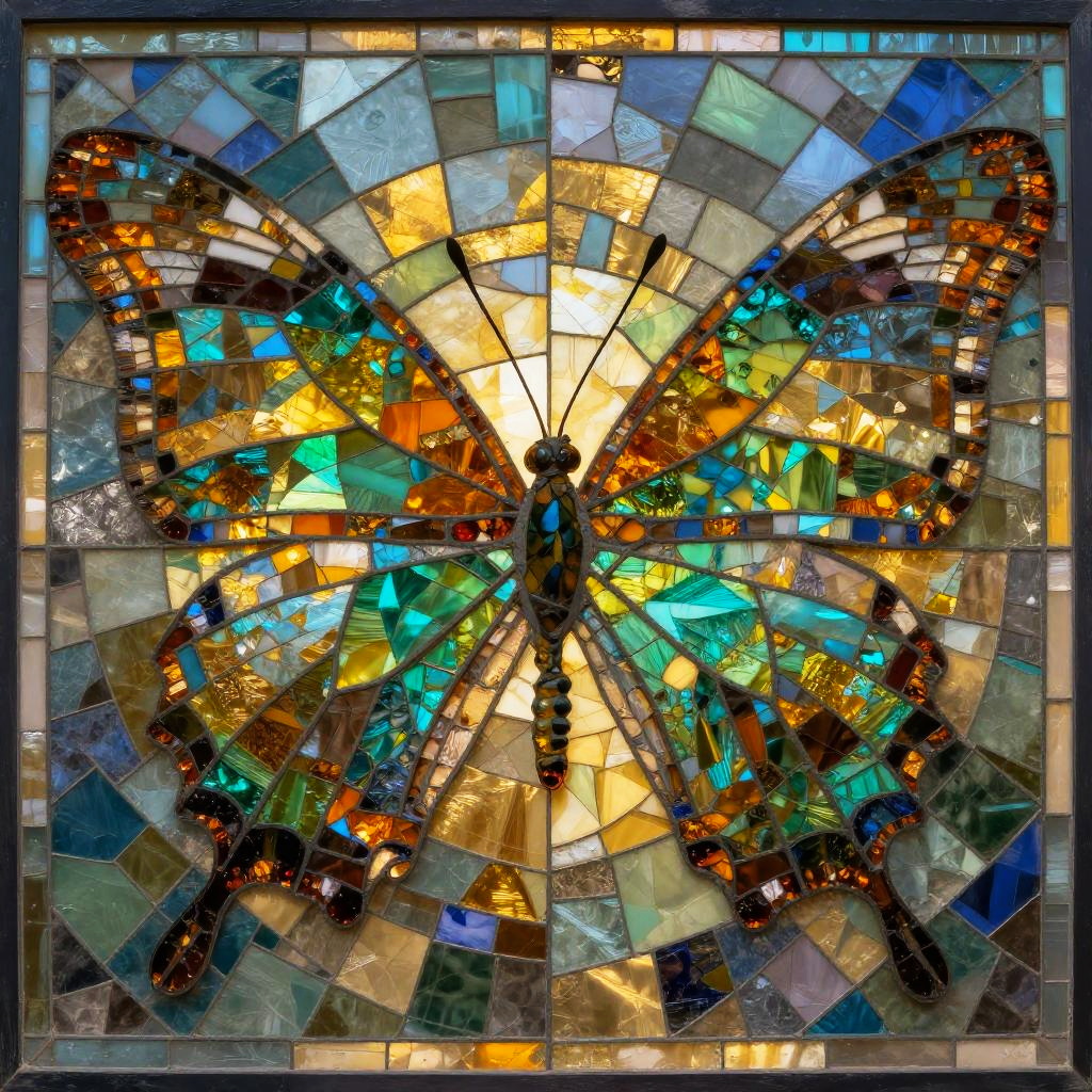 A detailed digital artwork featuring a graceful butterfly composed of a mosaic of small, colorful stained glass that form a fragmented, pixelated effect. The subject is portrayed in a art nouveau style, with carefully arranged blocks creating depth and definition. The color palette is vibrant, including shades of amber, turquoise, jade green, gold that reflect light, giving the artwork a luminous quality.