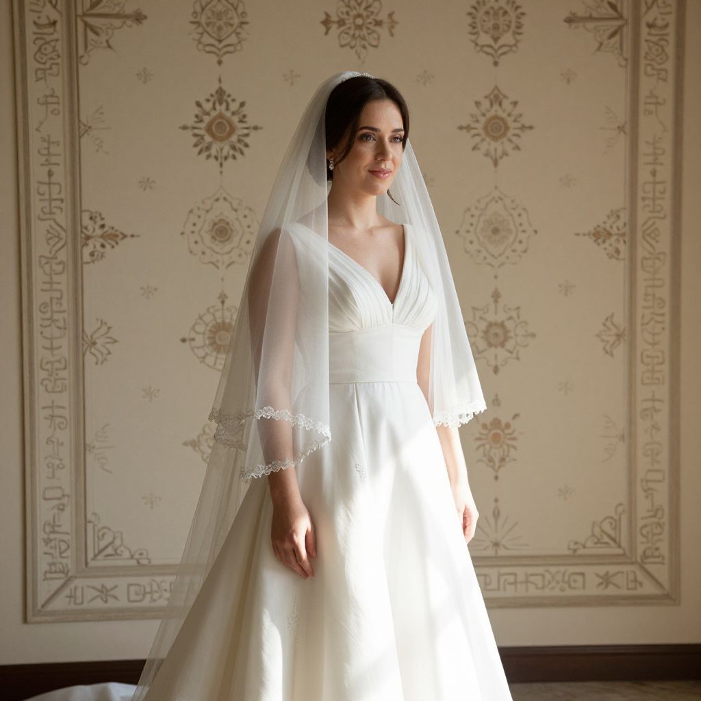 Photograph of a young woman with fair skin and dark hair, wearing a white, V-neck, satin wedding dress with lace-trimmed sleeves and a long, sheer veil. She stands in a softly lit room with ornate, cream-colored wallpaper featuring geometric and floral patterns. The light from behind her casts a gentle glow on her dress, highlighting its smooth texture. She has a calm, slightly pensive expression, and her dark hair is partially visible under the veil. The overall ambiance is elegant and classic, with a focus on her bridal attire and serene presence.