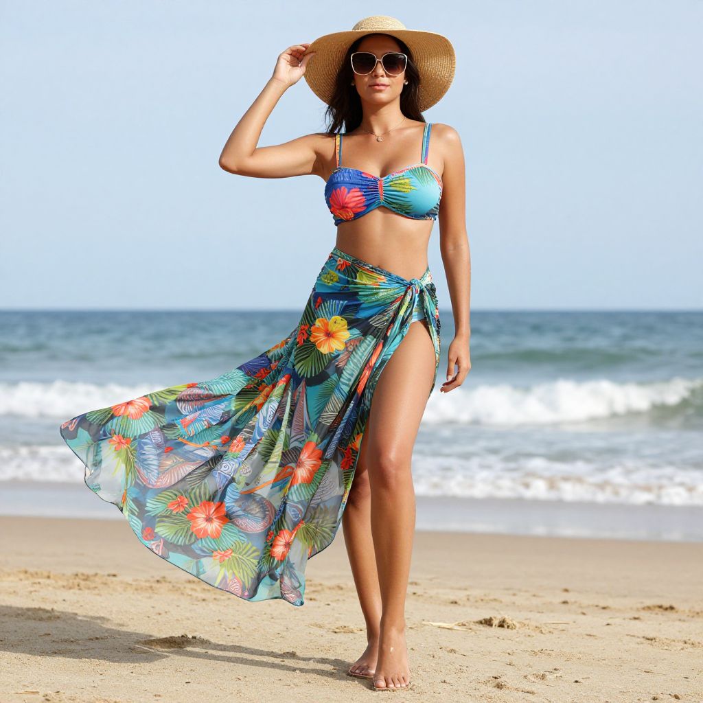 Full body shot, slim woman, vibrant tropical sarong wraps, lightweight chiffon fabric, flowing and breezy, intricate floral patterns, high-waisted tankini top, soft stretch nylon blend, adjustable straps, ruched detailing, matching sarong tied at the waist, beach sandals, woven straw hat, oversized sunglasses, sun-kissed skin, relaxed beach vibe Sexy. Pretty face and beаutiful eyes. Big breasts