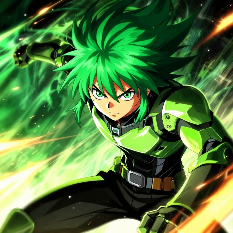 Green hair anime guy in an intense battle scene, hair fluttering wildly, dramatic lighting with sparks and motion blur, bold color palette, stylized anime art, sharp intense gaze, futuristic armor with neon green accents, dynamic action pose, explosive energy effects.