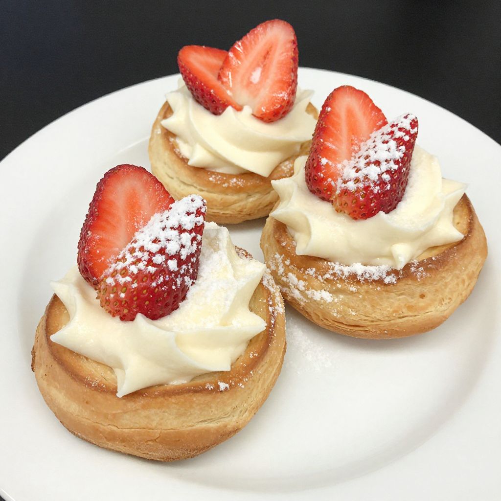 Two golden-brown danishes topped with creamy white filling, fresh strawberry slices, and powdered sugar, elegantly presented on a white plate at Whole Foods Market - Palo Alto.