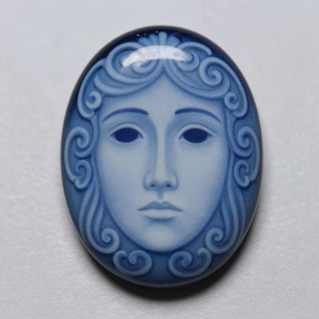 \"Handmade glass cabochon - \"\"Mask\"\" - 40x30mm or 25x18mm oval, horizontal orientation, wide, woman face, blue, swirls, Art Nouveau collection\