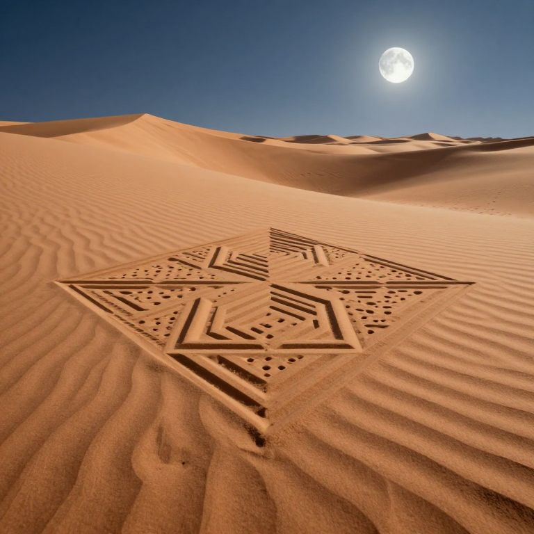 Photograph of a desert landscape under a clear blue sky with a bright, full moon. The foreground features rippled sand dunes with a large, intricate, geometric pattern etched into the sand, resembling a star with triangular and rectangular designs. The pattern casts distinct shadows, enhancing the texture of the sand. The moonlight casts a soft glow on the dunes, highlighting their undulating forms. The image captures the serene beauty and stark simplicity of the desert environment.