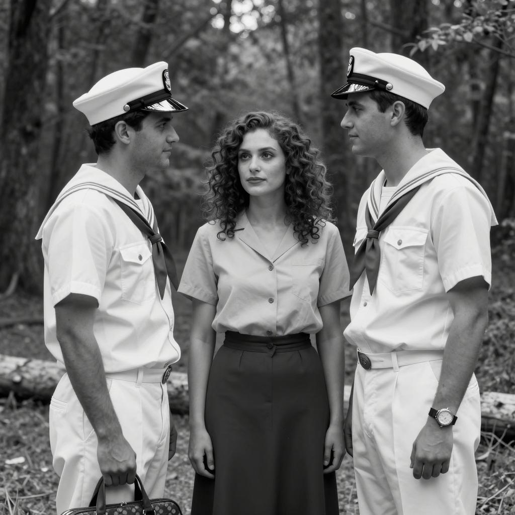 Photograph of three male sailors in white uniforms and hats, standing and posing energetically in front of the Statue of Liberty. The sailors on the left and right have short dark hair, the sailor in the middle has short brown hair. The Statue of Liberty holds a torch in her raised right hand. The sky is blue with a few clouds. The sailors on the left and right look upward, while the sailor in the middle points forward. Trees are visible in the background.