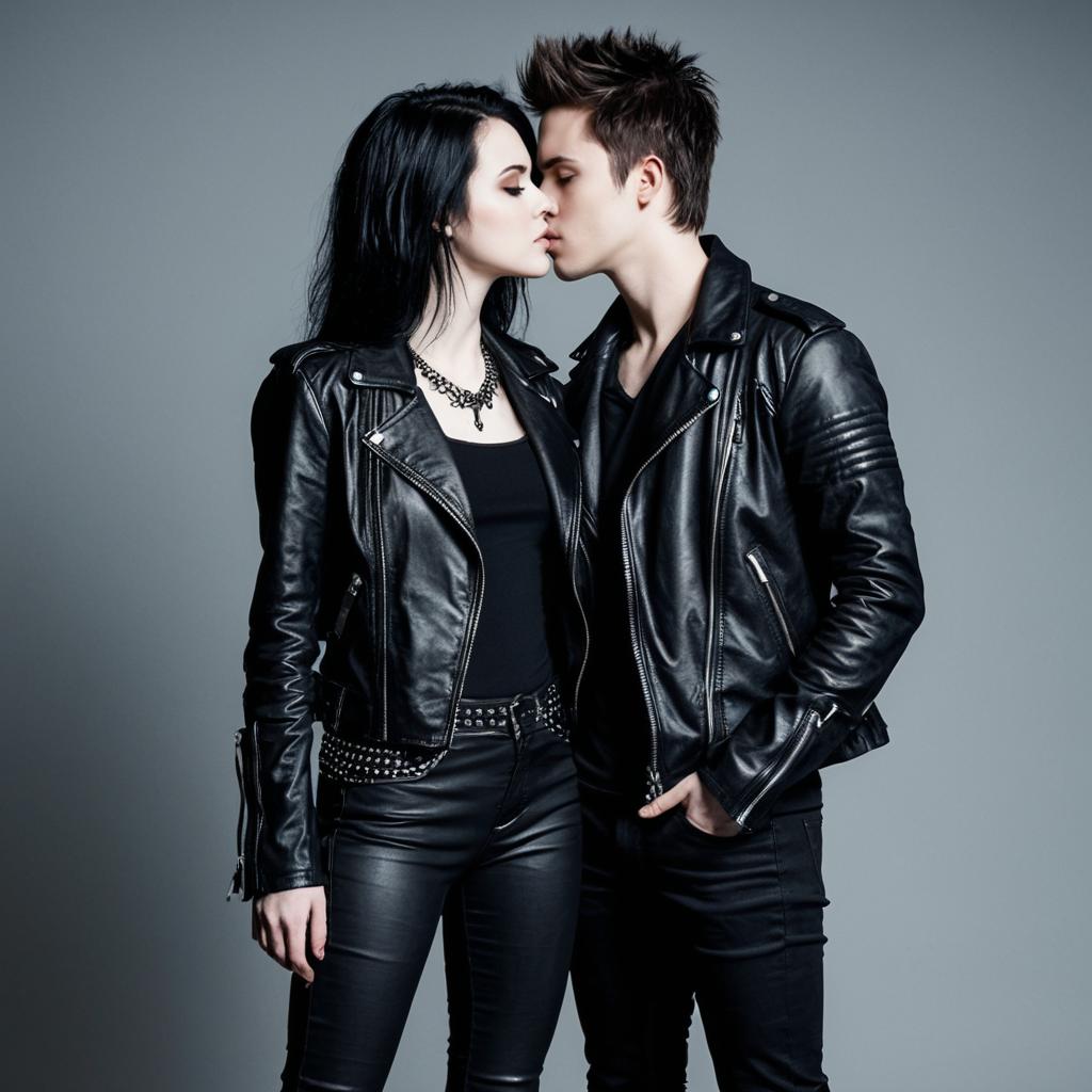 Portrait of a young man with pale skin and messy dark hair wearing a black leather jacket, slim black pants, a black t-shirt, fingerless gloves with spikes, a silver chain necklace, and a black belt with a silver buckle. The background is plain grey studio setting. The style is gothic and edgy.