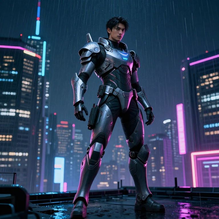 Photorealistic CGI of a muscular man with purple hair in a black, metallic superhero suit, striking a powerful pose on a rainy, neon-lit