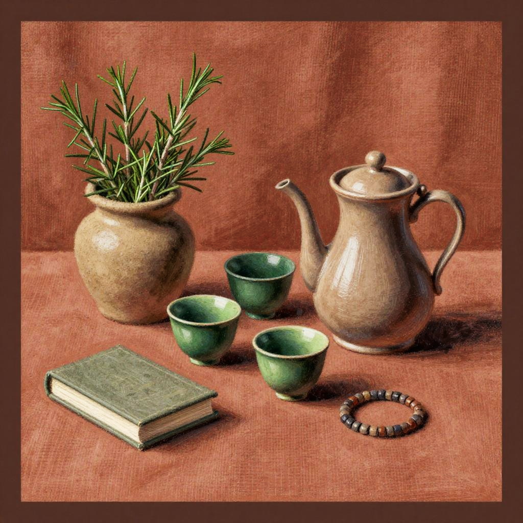 This is a soft chalk drawing of a decorative still life featuring a rough sandy beige ceramic pot filled with sprigs of rosemary on the left, three deep emerald green tea cups in the center, and a glossy light taupe stoneware coffee pot on the right. A small book and a coiled bracelet sit in front, with gentle highlights and soft shadows to suggest depth. The background is a warm terracotta colored linen backdrop, and the whole scene is framed with a dark brown border. Emphasize cozy tones, crisp edges, subtle surface texture, and calm, balanced composition.