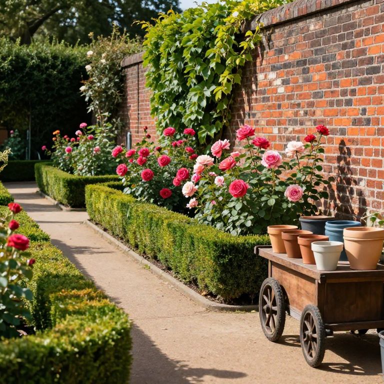 Gardenside pathway lined with neatly trimmed hedges and vibrant roses blooming in full, an old brick wall covered in ivy on one side, a cobbler’s cart displaying handmade pots, sunlight casting soft shadows, a peaceful countryside vibe.