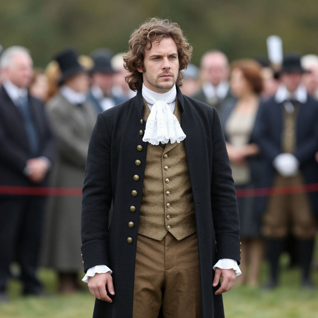 Photograph of a serious-looking Caucasian man with curly brown hair, wearing an 18th-century British military uniform. He has a white cravat, brown waistcoat, and black coat with gold buttons, and brown trousers. His expression is stern. In the blurred background, there are other men and women in similar period attire, standing in a grassy outdoor setting. The men wear black hats and dark coats, while the women have lighter-colored dresses. A red rope barrier separates the foreground from the background. The overall mood is historical and formal.