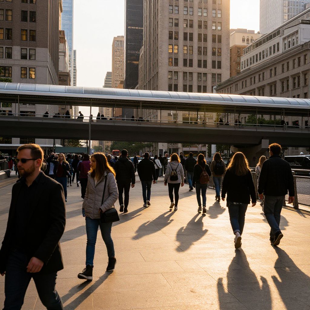 Beneath towering skybridges bathed in golden-hour sunlight, a bustling urban scene unfolds as crowds navigate the walkway, their shadows stretching long against the pavement, capturing the vibrant energy of a city where architectural grandeur meets the warmth of human connection.