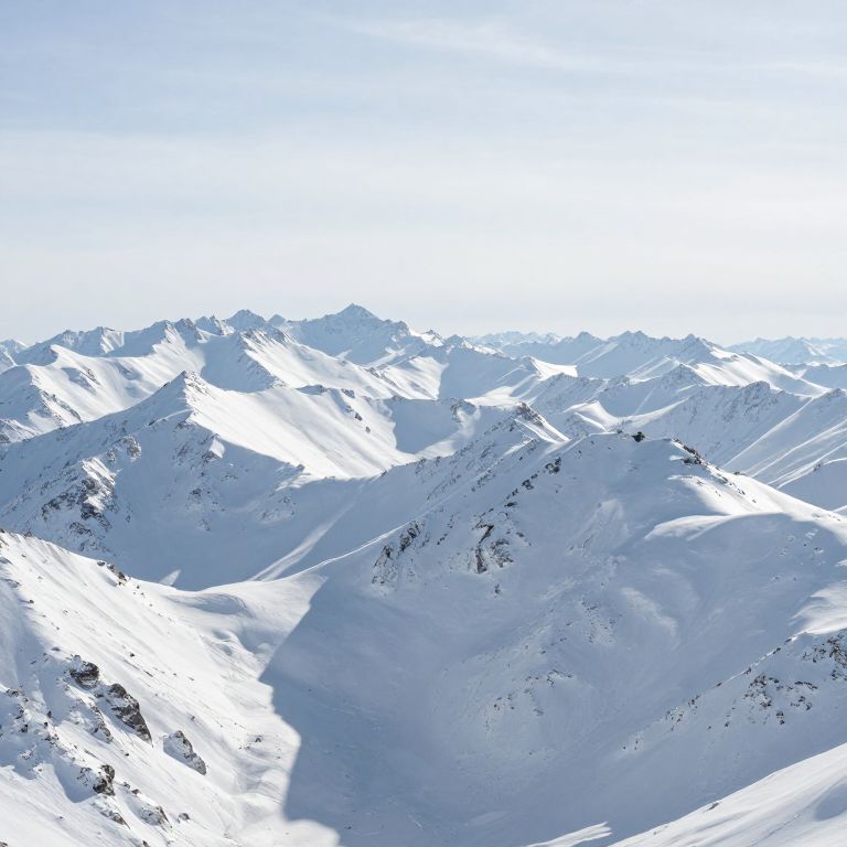 An endless expanse of pristine peaks stretches toward the horizon, their silent, sculpted forms evoking a profound sense of serenity and the timeless embrace of solitude, while the crisp, cold air whispers the quiet majesty of nature's enduring grace.