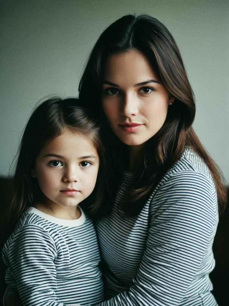 Woman with Daughter in Matching Outfit, photorealistic family portrait, cinematic realism