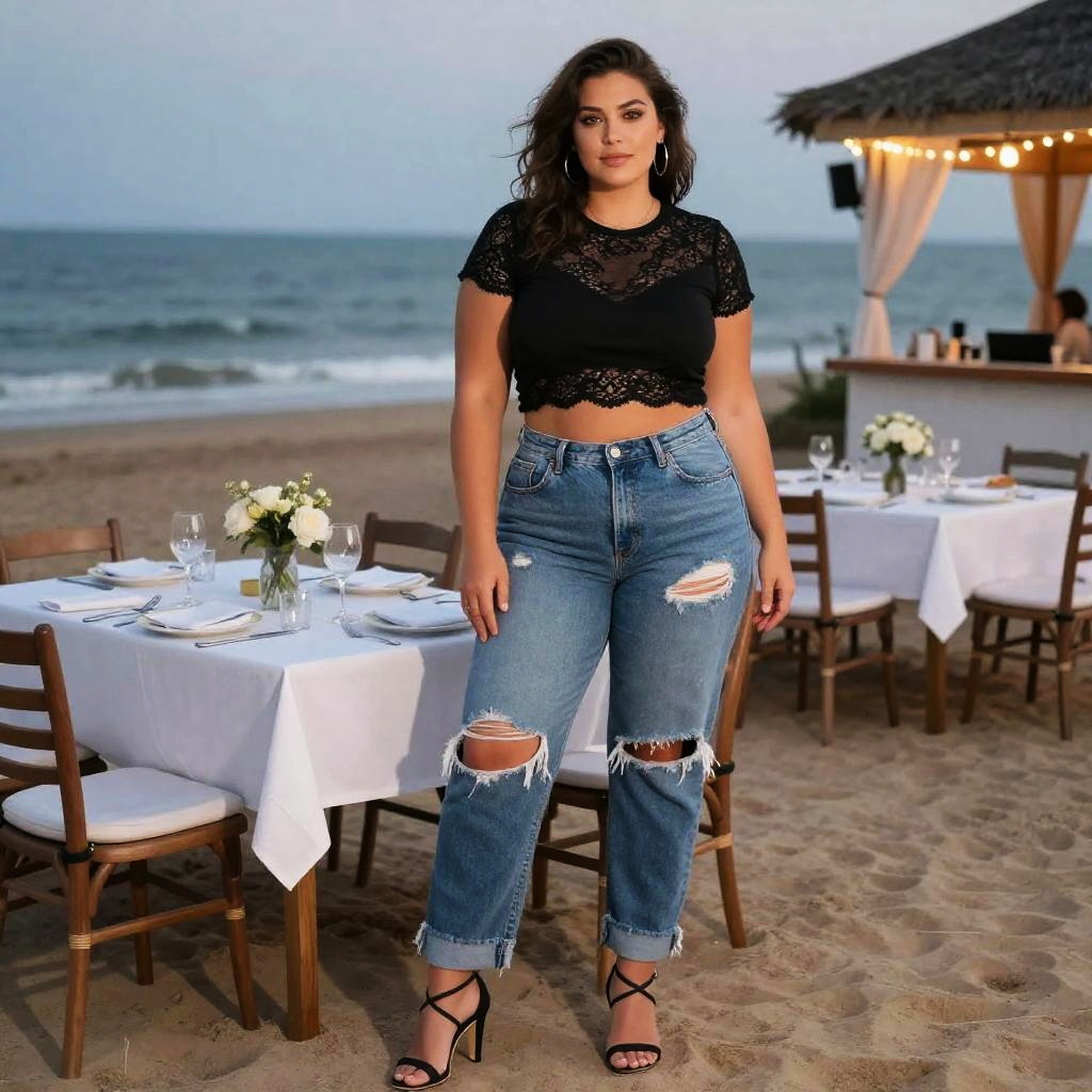 A lanky woman in a drawn and quarterly style, wearing a cropped black T-shirt with lace detailing, high-waisted distressed denim jeans with knee holes, and nude strappy heeled sandals, standing at a Dusk Beach Dinner at a Beachside Bungalow. Sexy. Pretty face and beutiful eyes