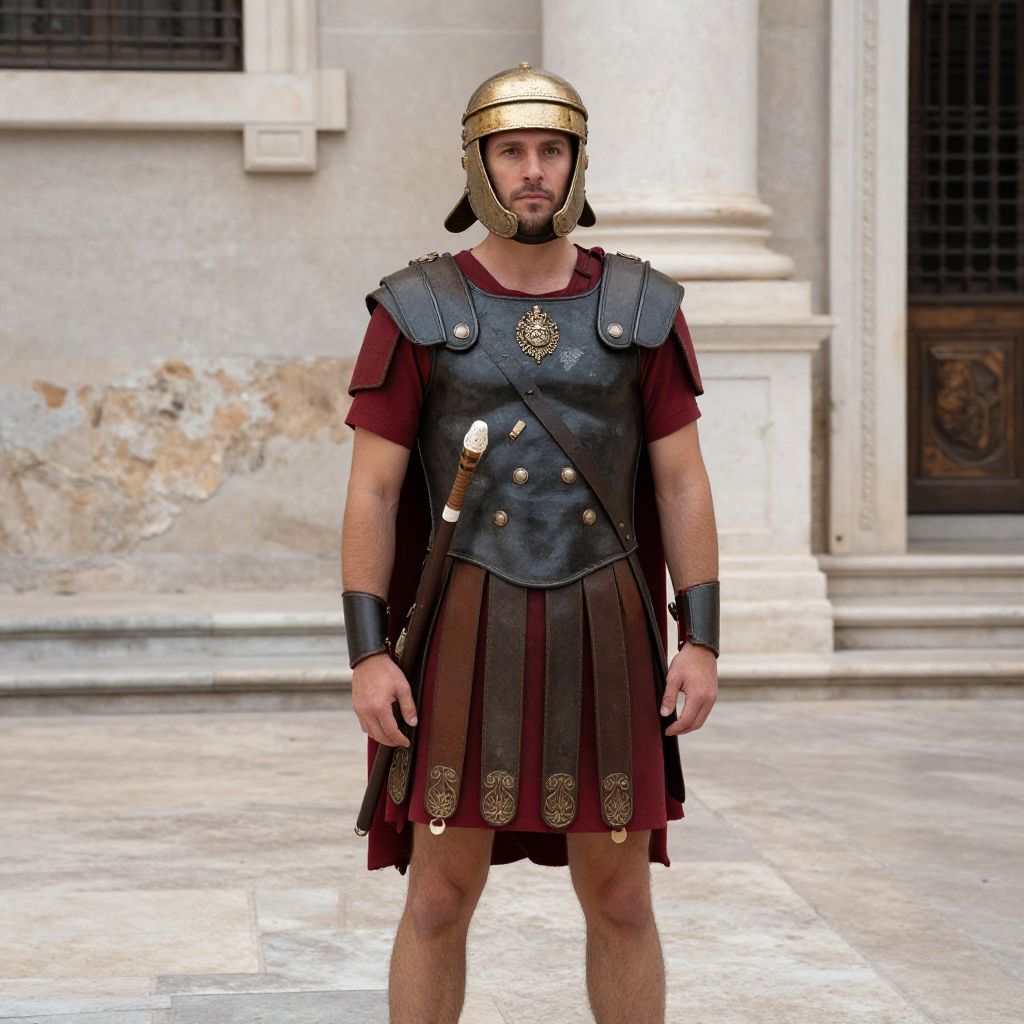 Photograph of a bearded man in ancient Roman soldier attire, including a bronze helmet, black leather chest plate, and maroon pleated tunic