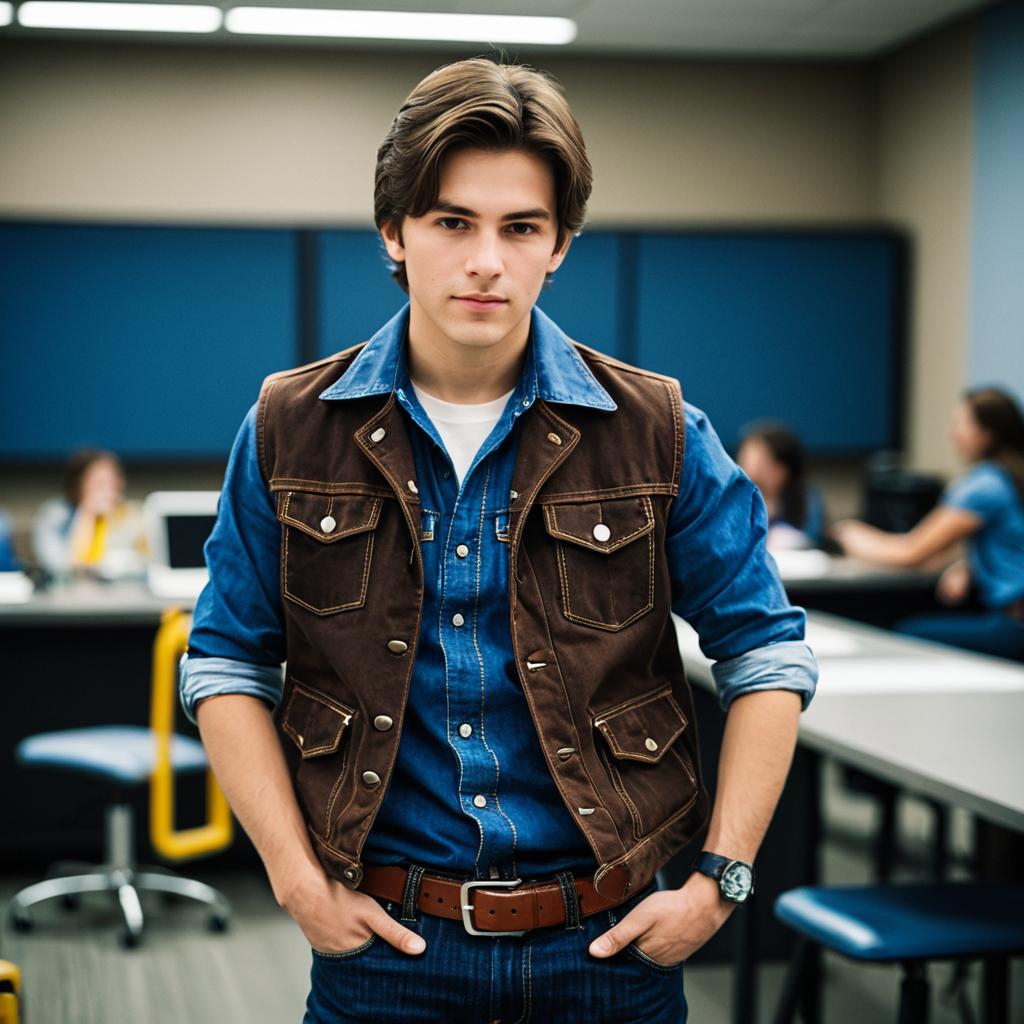 Engineer costume,1boy, male focus, solo, vest, pants, shirt, watch, realistic, wristwatch, brown hair, indoors, looking at viewer, sleeves rolled up, belt, blue shirt, blurry background, denim, brown vest, standing, jeans, closed mouth, blurry