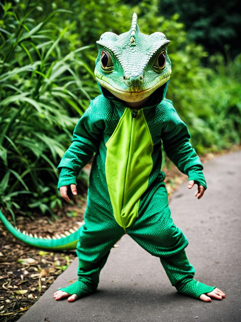 Child in Green Lizard Costume Outdoors