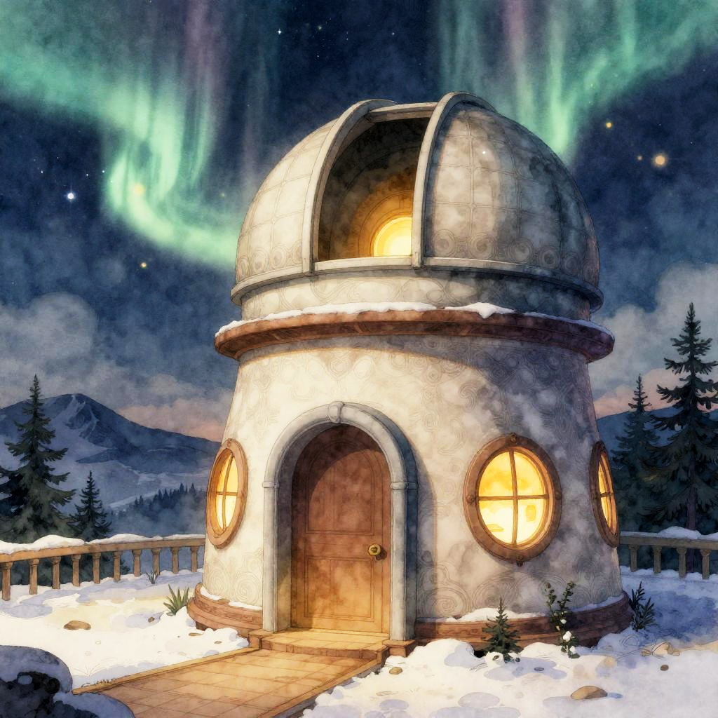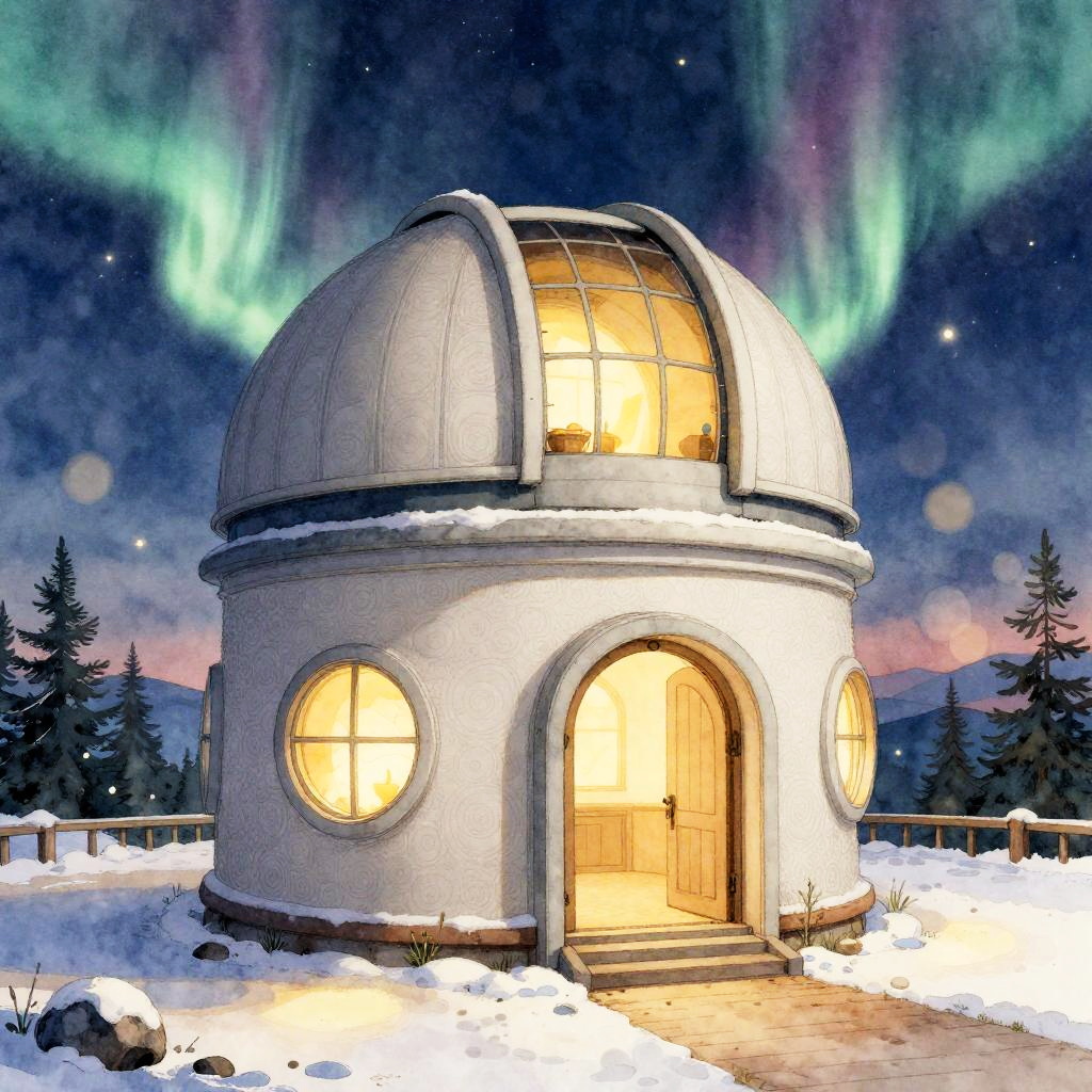 Photograph of a snow-covered, dome-shaped observatory at night, illuminated by warm interior light. The observatory has a silver dome with a glass section, circular windows on either side of a wooden arched door, and a brick pathway leading to it. Aurora borealis lights the dark, starry sky above. Evergreen trees and distant mountain ranges frame the background. Snow blankets the ground, enhancing the serene, wintry atmosphere. The observatory's lights create a cozy, inviting contrast to the cold, dark surroundings.