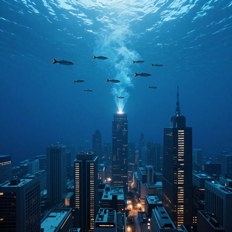 Digital artwork of a cityscape at night with blue underwater lighting, fish swimming above, and a central building emitting a blue light.