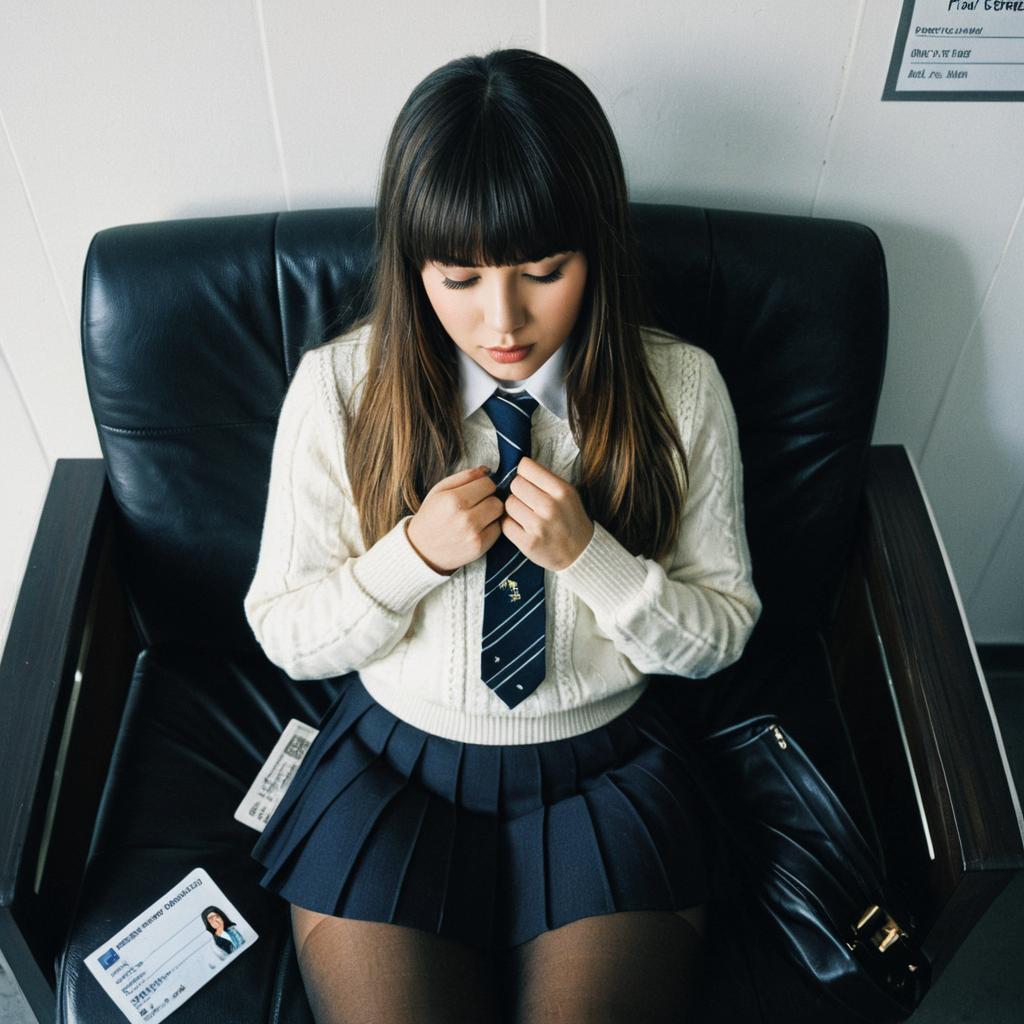 1girl, rio, blunt bangs, long hair, halo, hair ornamentwhite sweater, pantyhose, skirt, sitting, crossed legs, id card, jacket, from above, hand on own chest, suit, groping