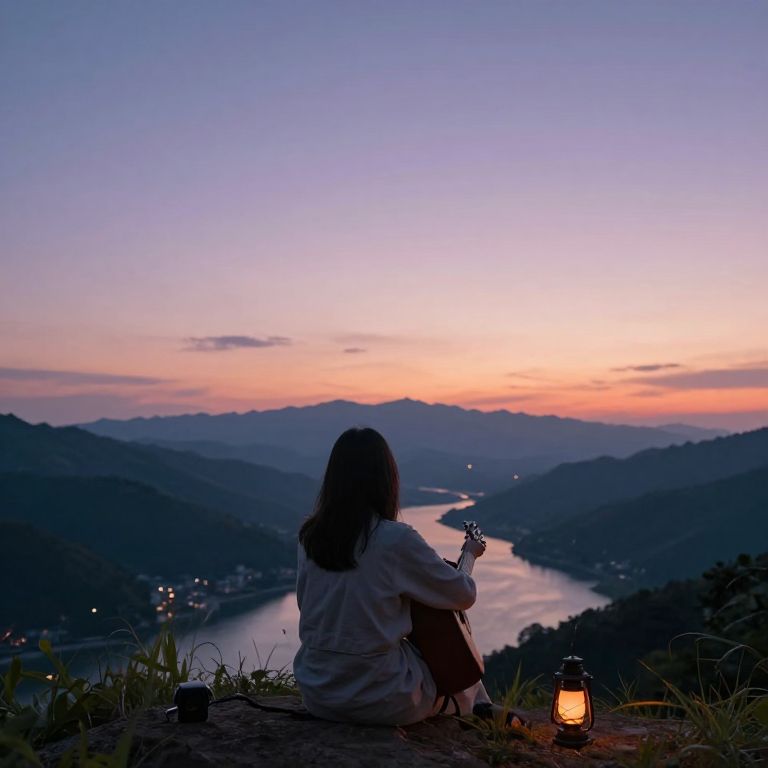 Minimalist Lifestyle distance view, Girl playing guitar watching the dusk, lofi style, Mountain, river, colorful, high resolution, ultra detail, 8k,