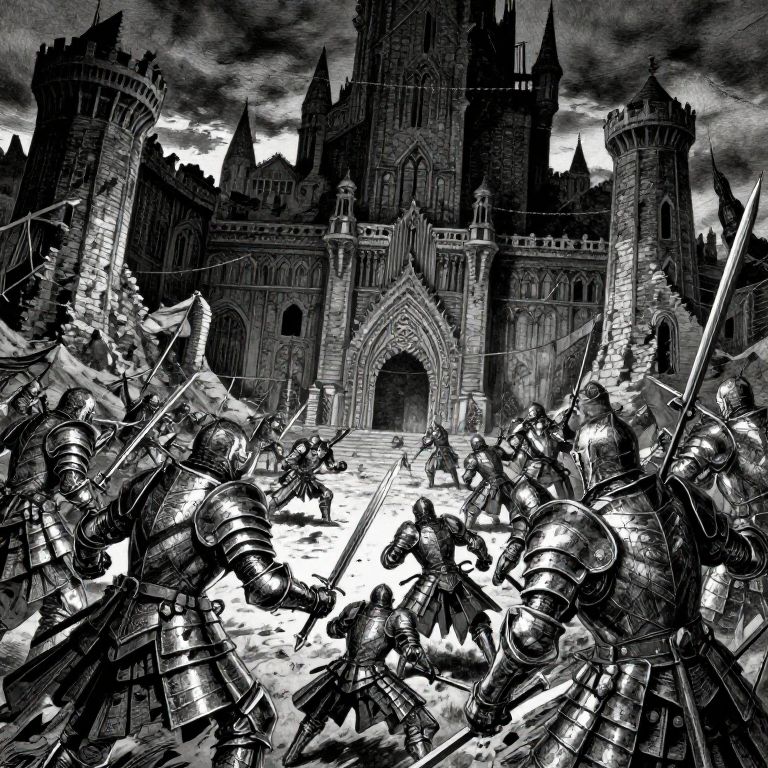 Black-and-white digital drawing of armored knights in fierce battle at a gothic castle, swords raised, intense shadows, dramatic sky.