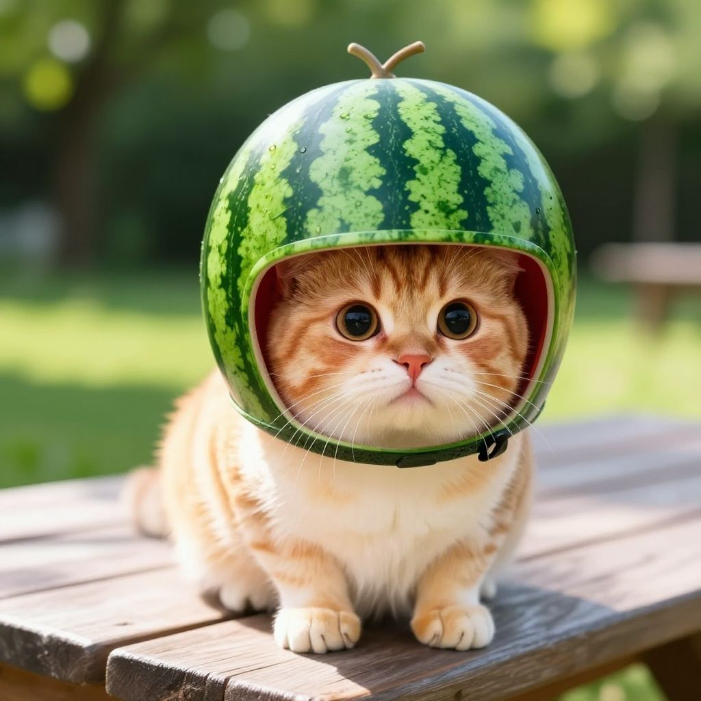 Watermelon helmet cat sitting on a sunny picnic table, vivid green and red watermelon texture on the helmet, playful and cute feline with big curious eyes, summer vibes