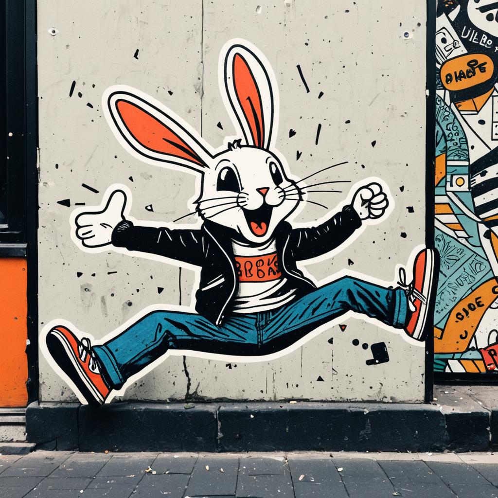 Vibrant street art mural of an orange octopus skateboarding against a graffiti ocean wave background. The artwork features dynamic brush strokes and gritty textures inspired by lowbrow art and the style of Jean Rawlins. The skateboard has yellow wheels and is positioned on an asphalt surface.