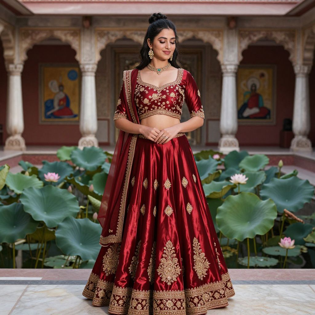 A graceful woman with long black hair tied in a bun and a serene, gentle smile wears a luxurious fancy satin lehenga costume made of deep red satin with golden floral embroidery. She stands in front of a traditional haveli (mansion) with marble columns, rich paintings, and a courtyard filled with lotus flowers, the light reflecting off the satin surface.. The woman has big tits and cute face