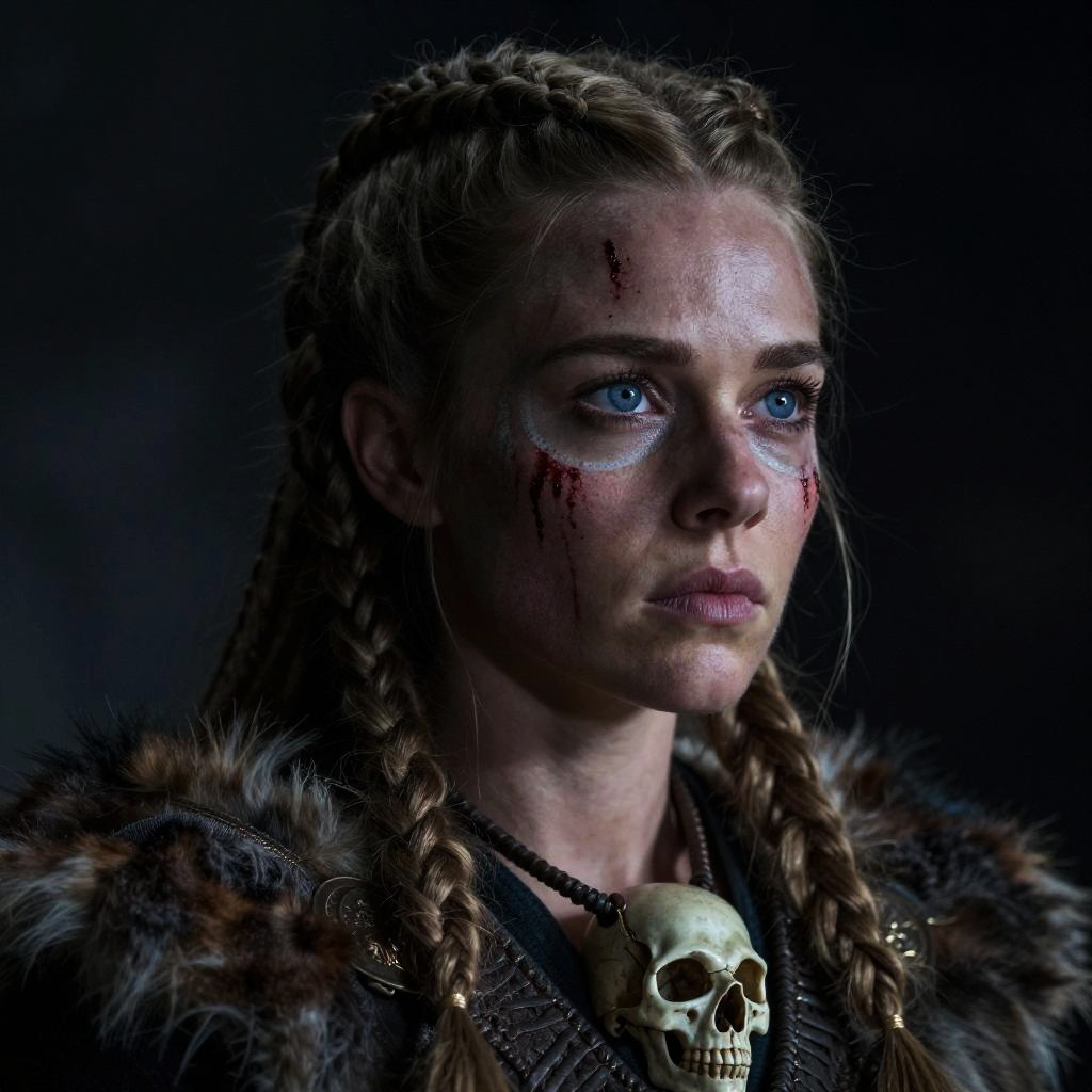 Cinematic film still dramatic side lighting, dramatic intense stare closeup portrait, dark black background, hdr, dramatic beautiful warrior woman with warrior face paintings and blood, viking braids, blue eyes, pelt, skull necklace, shallow depth of field, vignette, highly detailed, high budget Hollywood film, cinemascope, moody, epic, gorgeous