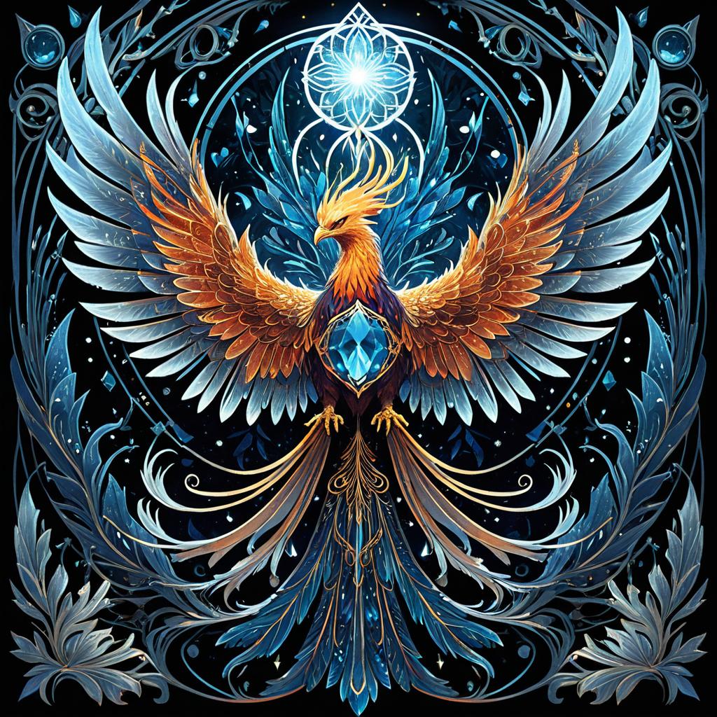 Symmetry!! portrait of a crystalline phoenix with ethereal wings set against a glowing midnight crystal forest, featuring intricate metallic filigree and luminous circuitry, digital painting, concept art, ArtStation quality, smooth, sharp focus, illustration by Alphonse Mucha, Lois van Baarle, 8K.