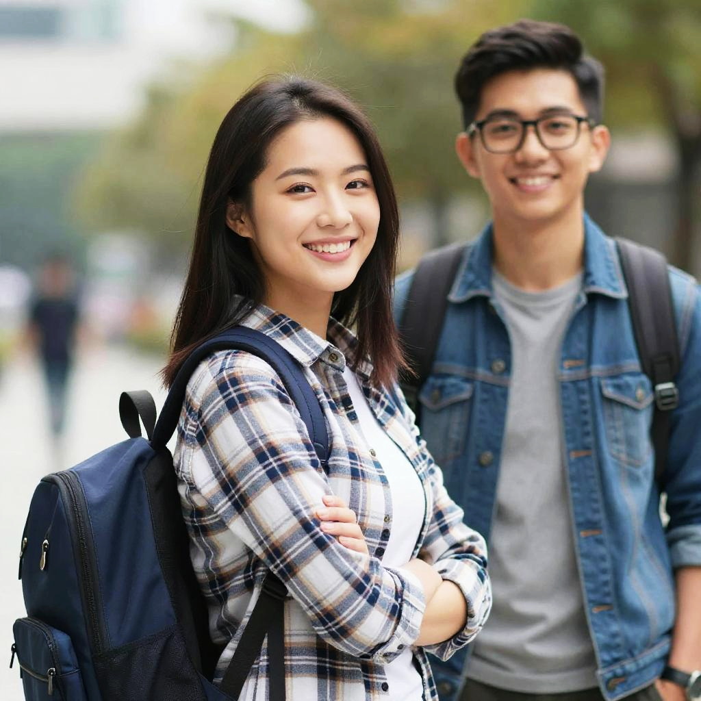 1girl, 1boy, bag, smile, plaid shirt, black hair, long hair, backpack, realistic, glasses, denim jacket, shirt, outdoors, grin, blurry background, blurry, jacket, blue shirt, asian, plaid, looking at viewer, holding, long sleeves, crossed arms, dark skin