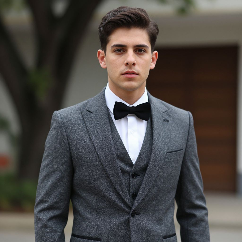 Fall groom attire costume, 1boy, male focus, solo, bowtie, bow, hand in pocket, blurry background, blurry, flower, suit, formal, black hair, pants, vest, shirt, looking at viewer, jacket, black bow, black bowtie, facial hair, white shirt, tuxedo