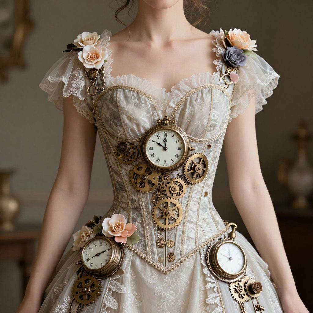 An ethereal steampunk vision emerges as a woman adorned in a corseted ensemble seamlessly blends Victorian elegance with mechanical marvels, her attire adorned with gears, clocks, and floral embellishments that defy the boundaries of time and fashion.