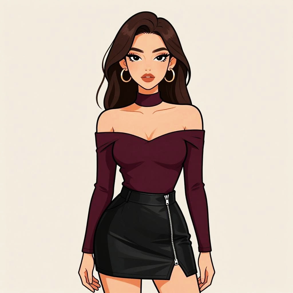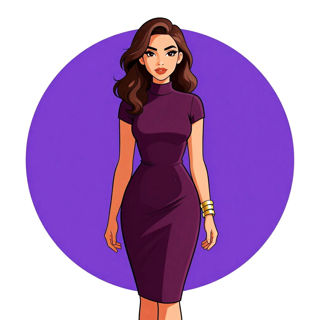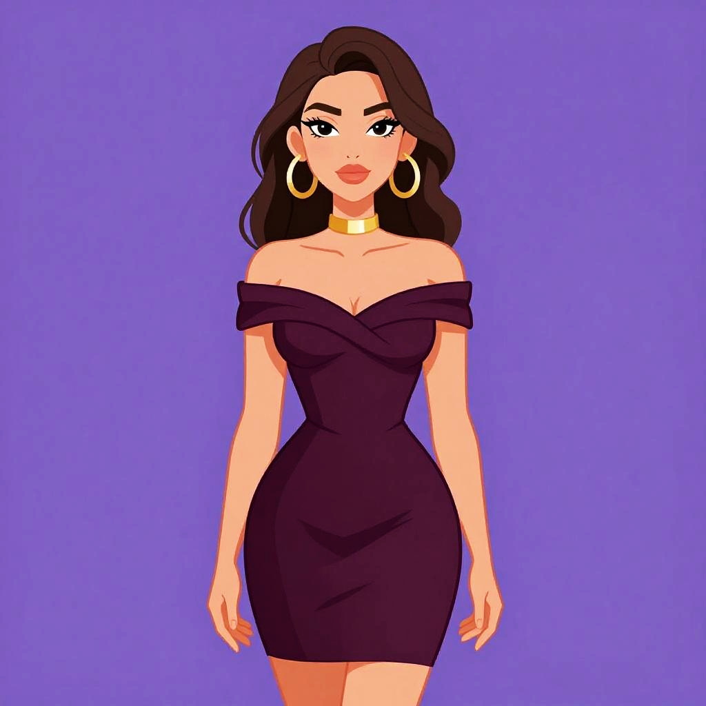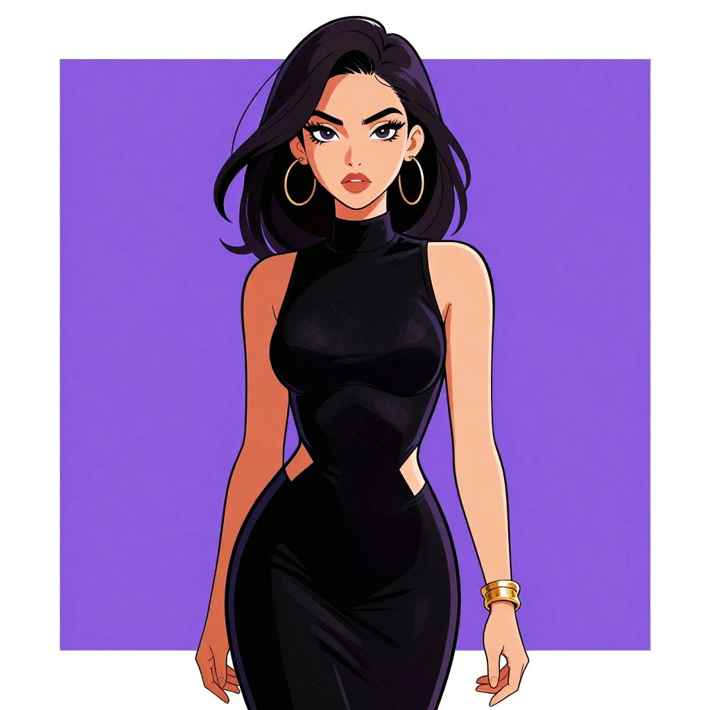 Illustration of a confident young woman with long black hair and striking facial features, wearing a sleeveless black velvet bodysuit with a high neck and an asymmetrical cut-out design on the torso. She accessorizes with large gold hoop earrings and a gold cuff bracelet, set against a purple rectangular background.
