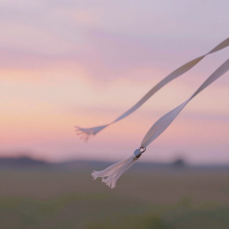 Photograph of a single white ribbon with tassels, captured in mid-air against a soft, pastel-colored sunset sky. The ribbon, adorned with a small black and silver bead at the center, appears to be gently blowing to the right. The background features a blurred, expansive field with dark green and brown tones, and a gradient sky transitioning from pink to purple. The image conveys a sense of lightness and movement, with the ribbon's delicate texture and the serene, dreamy atmosphere of the sunset.