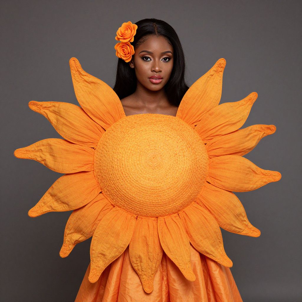 Raisin sun costume, solo, dark skin, dress, flower, 1girl, black hair, orange flower, hair ornament, orange dress, hair flower, dark-skinned female, orange rose, looking at viewer