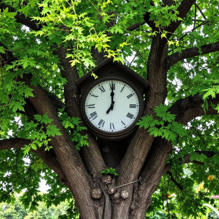 A whimsical clock embedded within the gnarled trunk of a living tree, adorned with vibrant green foliage that spills over its edges, defying the boundaries between nature and time.
