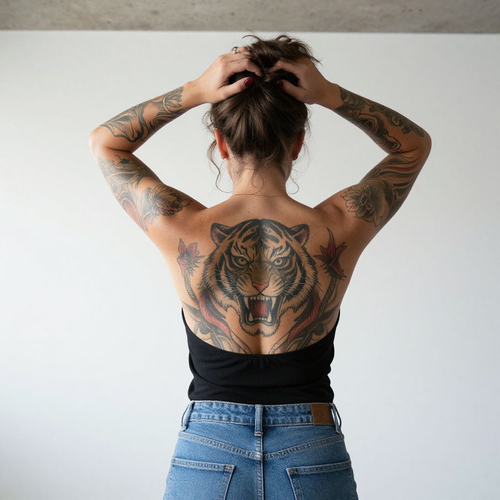 Tattooed Woman with Fierce Tiger Design