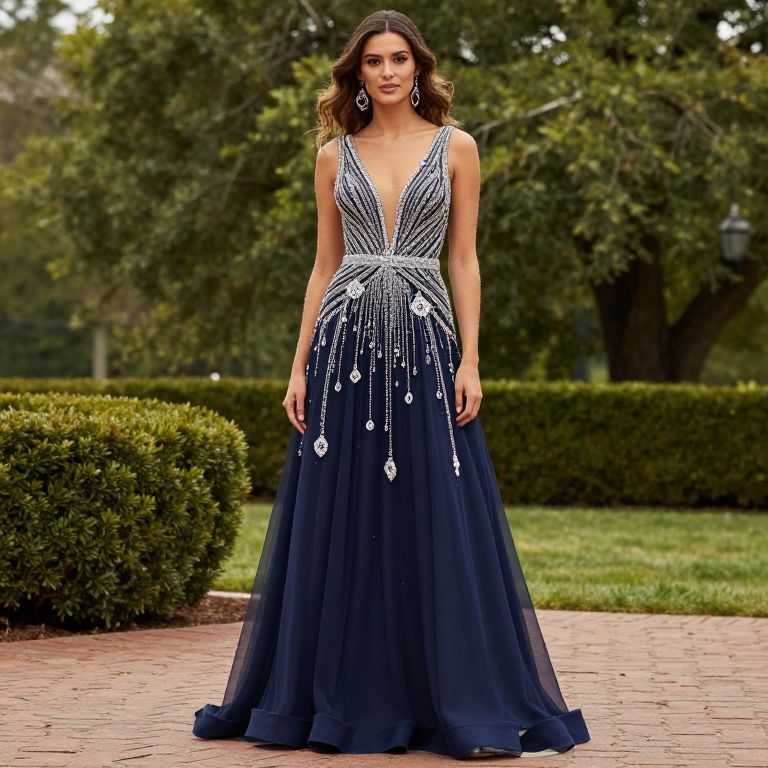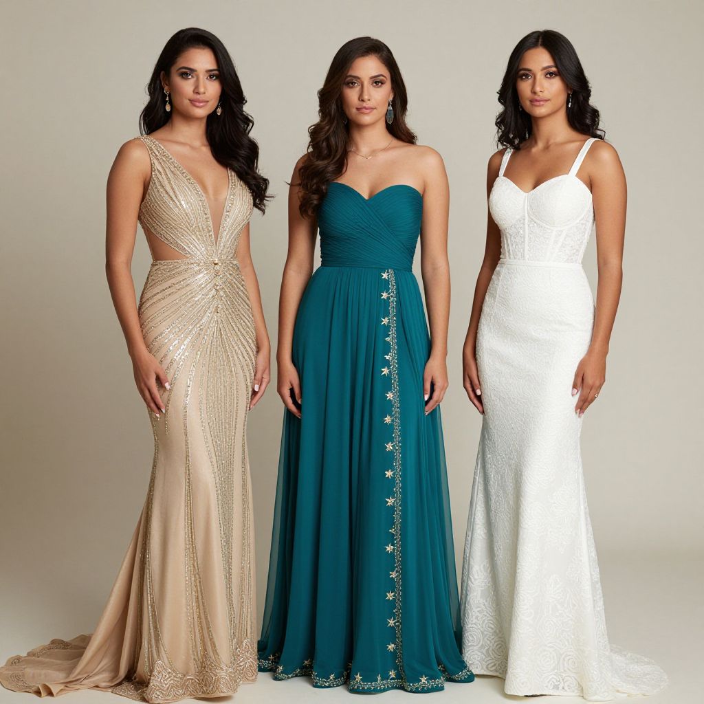 Photograph of three women in elegant evening gowns: left in beige with intricate lace, center in teal with button detail, right in white lace,