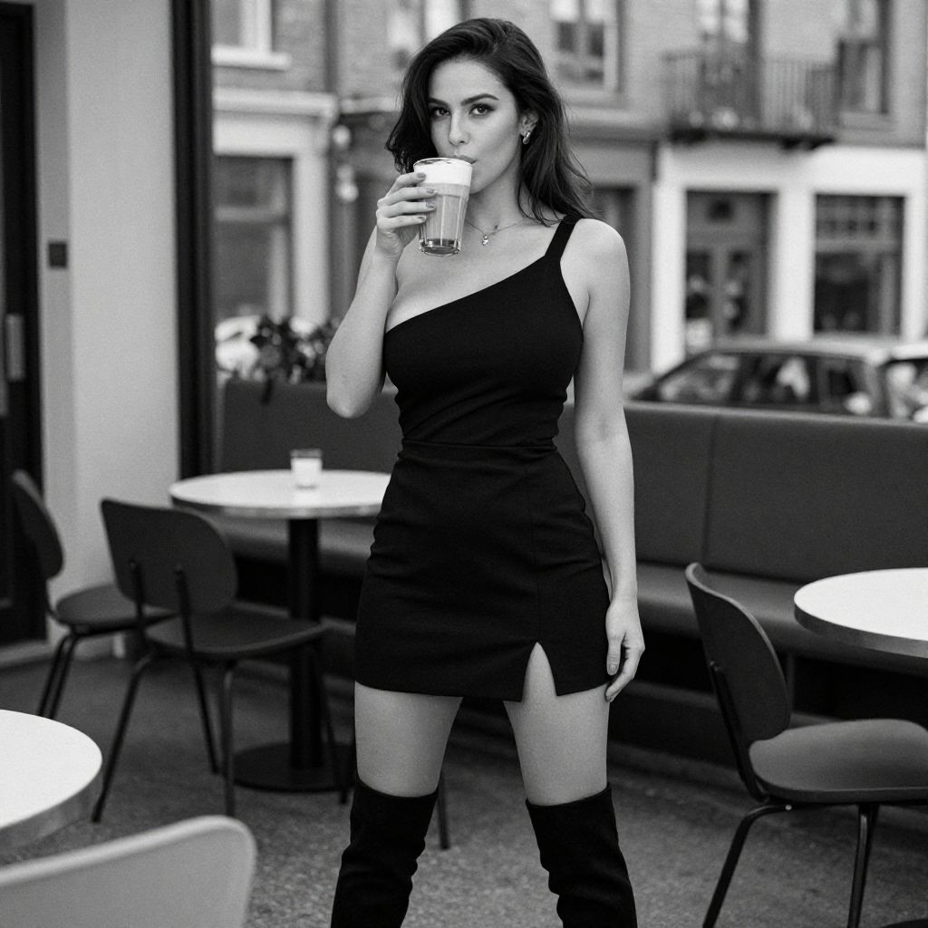 Black-and-white photograph of a young woman with dark, wavy hair, standing in a modern café. She wears a one-shoulder, black, mini dress with a thigh-high slit, and thigh-high boots. She holds a coffee cup to her mouth with her right hand. The café has round tables with chairs and large windows showing a cityscape with buildings and a car in the background. The woman's expression is neutral, and she stands confidently. The image has a high-contrast, gritty texture, emphasizing the urban setting and her stylish outfit.